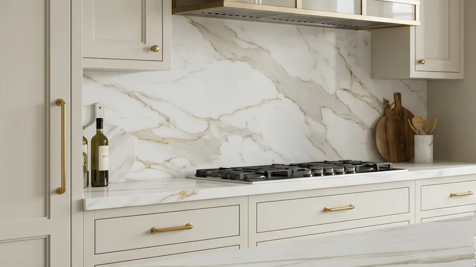 Dekton Entzo etterligner den eksklusive Calacatta-marmoren med sine gylne årer, men med en slitestyrke marmor bare kan drømme om.
